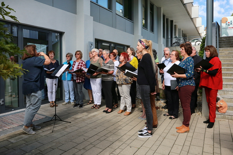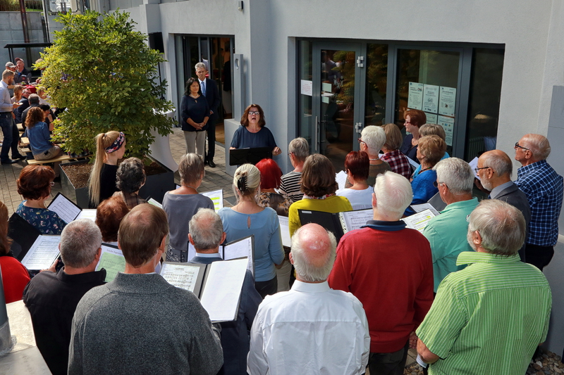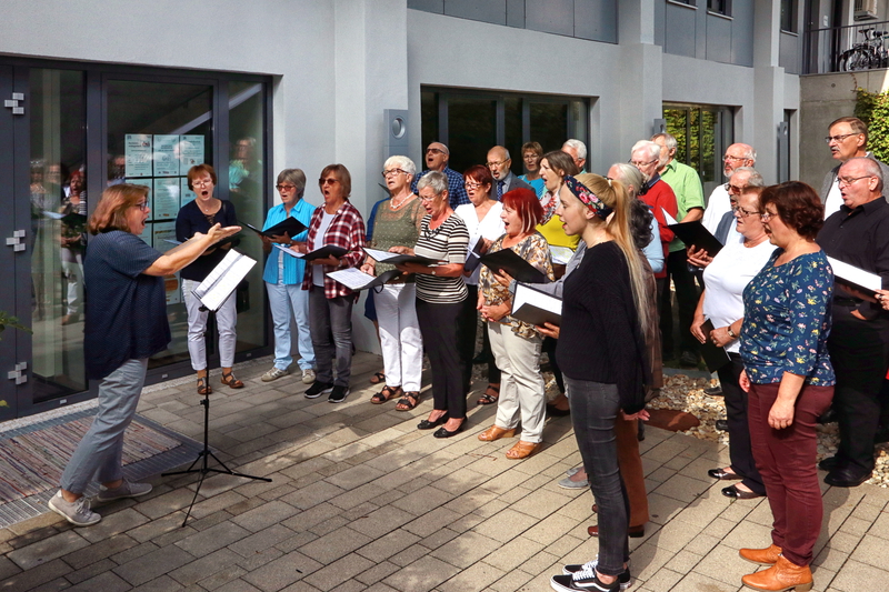 Am 28. September trafen wir uns um die Mittagszeit am Oberösch, um dem in den Ruhestand gehenden BSG-Chef Mario Dalla Torre ein kleines Ständchen zu bringen. Herr Dalla Torre war viele Jahre lang ein regelmäßiger Gast bei unseren Konzerten und bedachte die Chorgemeinschaft immer wieder großzügig mit Spenden. Deshalb war es uns eine Ehre, ihm bei dieser Gelegenheit mit ein paar Liedern Dankeschön zu sagen und ihm den Weg in den Ruhestand ein wenig zu verschönern. Mit dem "Lindenbaum", dem "Let my light shine bright", dem "Irischen Reisesegen" und "Yhakanaka" trafen wir auch seinen Geschmack, und so lud uns der Besungene auch gleich zu einem kleinen Imbiss ein.