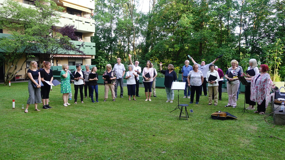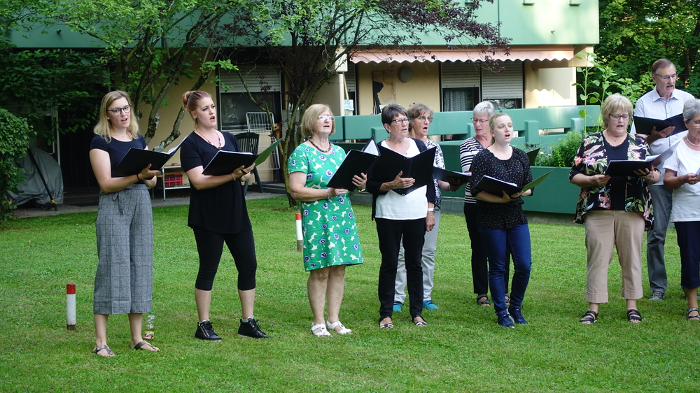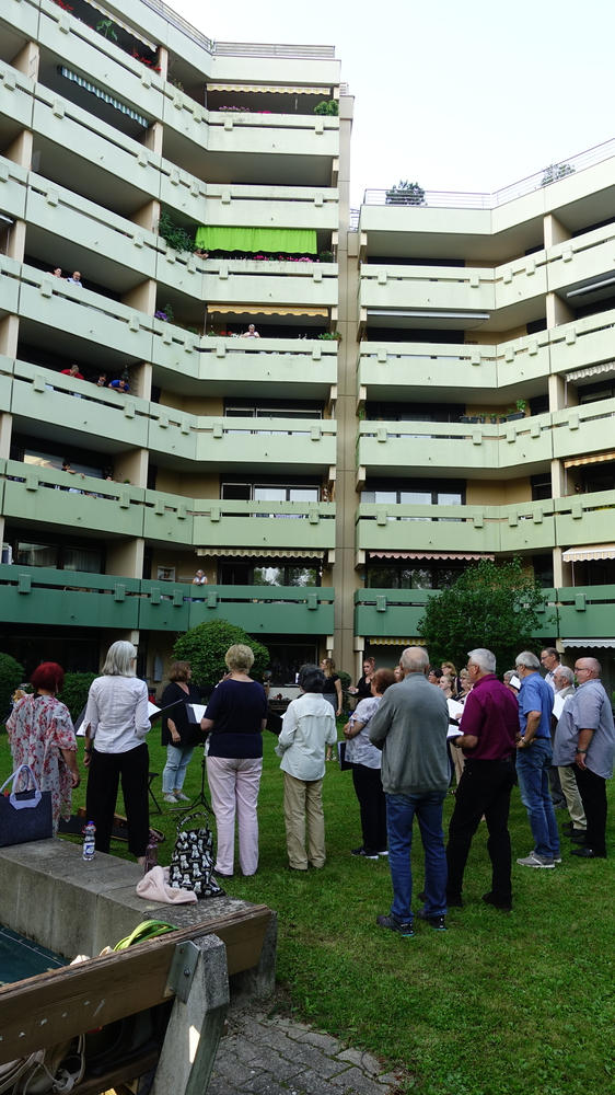 Im Anschluss daran fuhren wir nach Kempten in die Franz-von-Ried-Straße, um dort in dem Innenhof der Wohnanlage ein "Hinterhofkonzert" zu gestalten. Unsere Altistin Ingrid wohnt dort und lud mit Handzetteln die Bewohner der Anlage zum Zuhören ein. So waren auch viele Balkone besetzt, und wir bekamen viel Beifall für unsere teils fetzigen, teils ruhigen Lieder. Eva spielte dazu gekonnt die Gitarre, und Claudia unterstützte den Rhythmus mit ihrer Trommel. Nach einer guten halben Stunde verabschiedeten wir uns aus diesem Innenhof, nicht ohne vorher noch ein Dankeschön von Ingrid in Form eines Steckerleises zu bekommen.