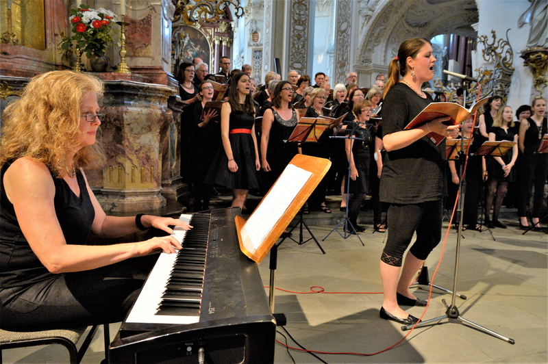Unsere Chorleiterin Eva Brunner hatte diesen Auftritt als Chor-Projekt konzipiert, und deshalb sangen mit uns noch weitere etwa 20 Sängerinnen und Sänger mit viel Freude und Engagement dieses Werk von Lorenz Maierhofer. So präsentierte sich die "erweiterte Chorgemeinschaft" vor dem Chorraum der ehrwürdigen Barockkirche als sehr stattlicher Klangkörper, umrahmt von einer kleinen Percussion-Gruppe und dem Keyboard. Trotz des lauen Sommerabends, der viele Menschen eher noch ins Freie lockt, fanden sich zahlreiche Zuhörerinnen und Zuhörer auf den Kirchenbänken ein, um uns zu lauschen. Und, wie wir aus vielen Meinungen am Ende heraushörten, bereuten sie es in keinster Weise, präsentierte sich die Chorgemeinschaft doch in sehr eindrucksvoller Manier. Man konnte es spüren und natürlich auch hören, dass alle Beteiligten - Chorleiterin, Sängerinnen und Sänger, Percussionistinnen und Keyboarderin - mit viel Lust am Singen diese teils schmissigen, teils gefühlvollen Lieder präsentierten. So war es kein Wunder, dass der Funke aus dem Chor schnell ins Publikum übersprang und dort Begeisterung entfachte. Auch konnten ein paar Sängerinnen und Sänger aus den eigenen Reihen als Solisten auftreten - Silke, Sandra (vom Chor Zabander), Norbert, Leo. Der Kaplan der Pfarrei St. Lorenz, der zu Beginn auch einleitende Worte sprach, trug die eingestreuten Texte von Persönlichkeiten der Friedensbewegung vor. Am Ende war ein lang anhaltender Beifall der Lohn für die vielen Proben, und erst nach einer Zugabe ließ uns das Publikum mit standing ovations gehen.