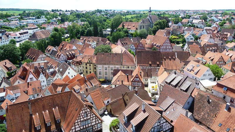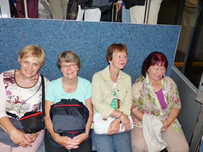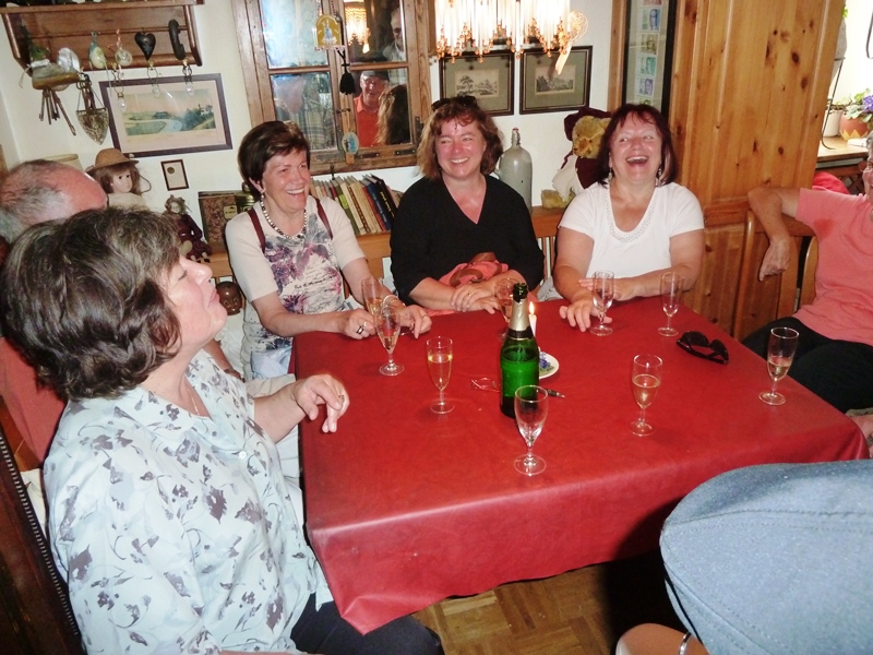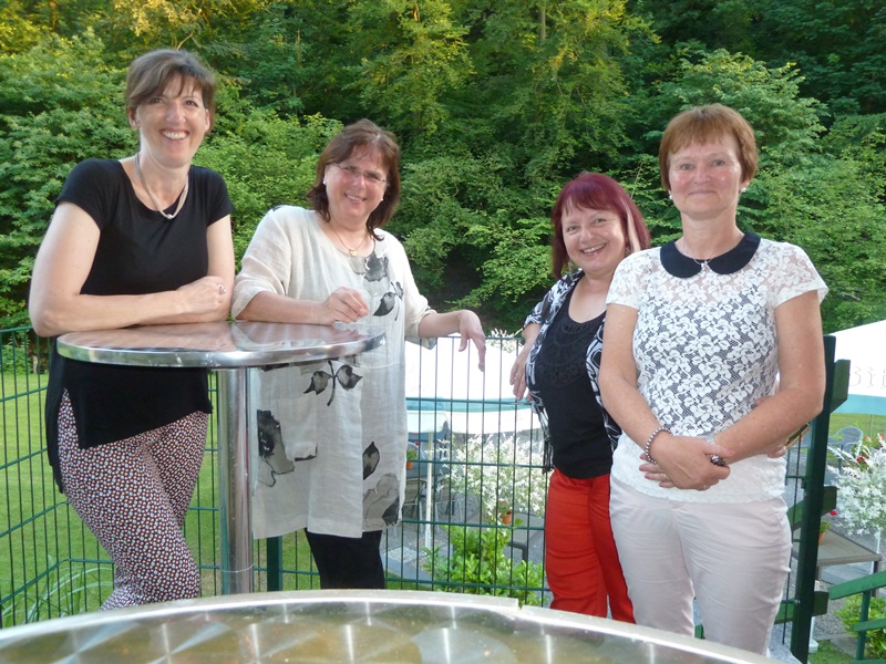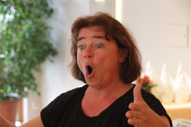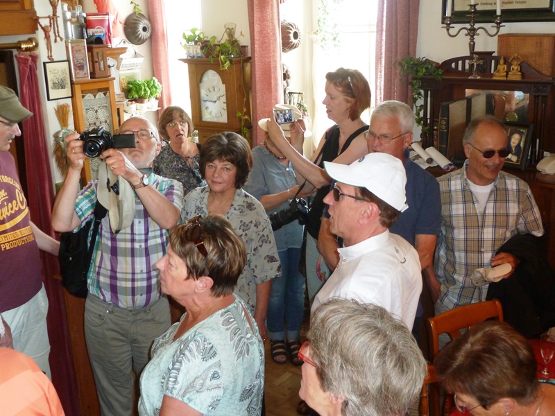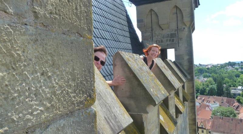 Schon um 9:00 Uhr am Sonntag mussten wir wieder auschecken, da wir pünktlich um 10:00 Uhr vom Schiffsanleger in Heidelberg ablegen mussten. Die Fahrt auf dem Neckar war lange auf der Kippe gestanden, da durch den vielen Regen der Fluss ziemlich Hochwasser hatte. Zum Glück sank der Pegel über Nacht ein wenig, so dass wir die eineinhalbstündige Fahrt flussaufwärts nach Neckarsteinach antreten konnten. In gemütlichem Tempo ging es an hochaufragenden Burgen, beschaulichen Dörfern und grünen Wäldern vorbei, und zum Glück hatten wir herrliches Sommerwetter. Von Neckarsteinach ging es per Bus weiter nach Bad Wimpfen, wo uns eine Begegnung der ganz speziellen Art erwartete. Im "Blauen Turm" dieser schönen Fachwerk-Stadt empfing uns nach über 160 Stufen Deutschlands einzige "Türmerin" Frau Knodel in ihrem Wohnzimmer auf etwa 25 m Höhe. Bei einem Glas Prosecco bestaunten wir ihr Reich dort oben in luftiger Höhe und hörten gebannt den außerordentlich humorigen Erzählungen der wahrhaftigen Lebenskünstlerin zu.