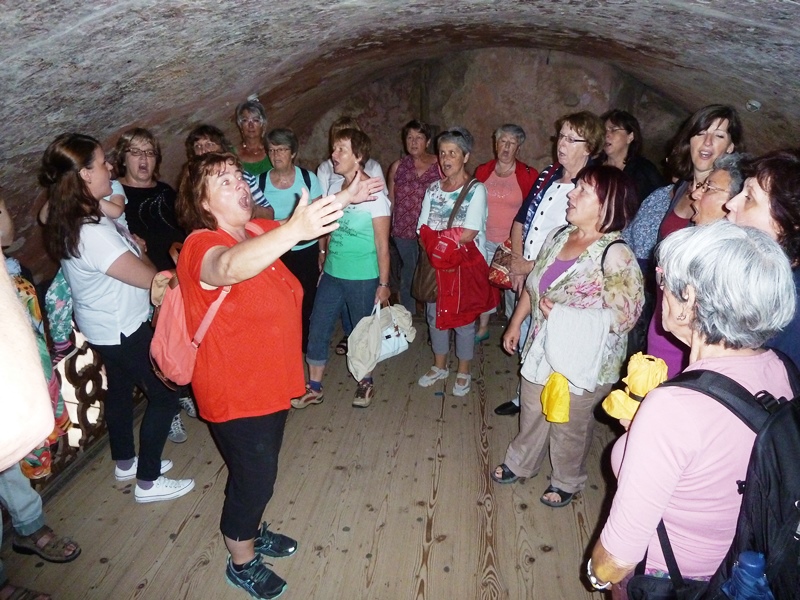 Am Samstag stand die Erkundung Heidelbergs auf dem Programm. Zunächst fuhren wir gemeinsam mit der Zahnradbahn hinauf zum berühmten Heidelberger Schloss, von dessen Terrasse aus seinerzeit schon Peggy March das unverwüstliche "Memories of Heidelberg" trällerte. Wir ließen es uns nicht nehmen, die enge Treppe zum riesigen "Großen Fass" rauf zu steigen. Oben angelangt, schmetterten wir in stickiger Luft und klaustrophobischer Enge einige Lieder und bekamen spontanen Beifall der allgegenwärtigen Touristen.