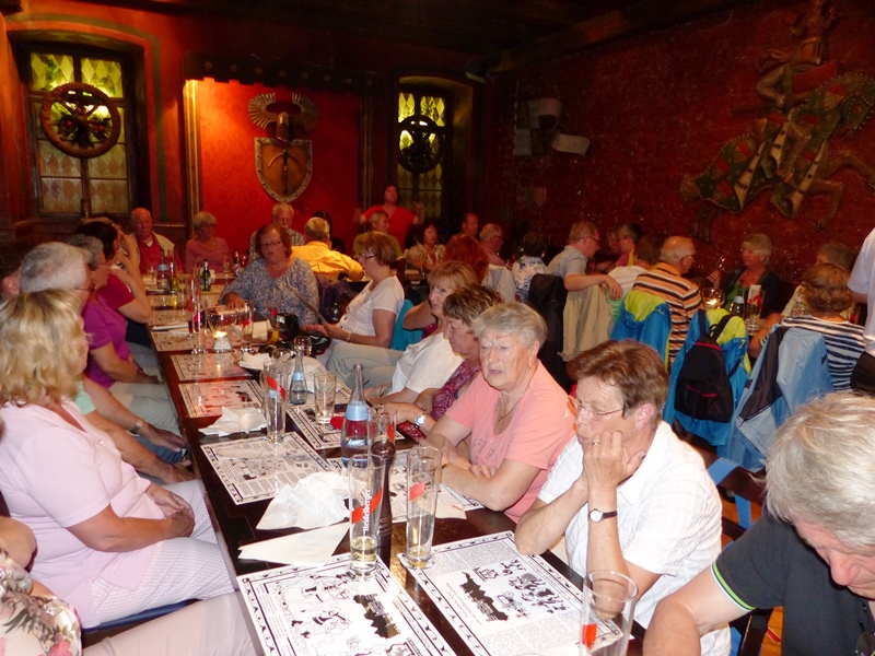 Am 24. Juni machten wir uns also gegen 13:00 Uhr auf den Weg, bei ca. 35 Grad im Schatten und etwas weniger im Bus, obwohl die Klimaanlage auf Hochtouren lief. Viele Baustellen und der Feierabendverkehr führten unterwegs auf der A 8 und der A 5 zu vielen Staus, so dass wir erst gegen 18:30 Uhr am Hotel "Scheid" in Schriesheim anlangten. Nach dem Abendessen konnten wir dann bei einer Weinprobe fünf verschiedene Weine der Schriesheimer Winzergenossenschaft probieren, wobei jeder seinen eigenen Favoriten "rausschmecken" konnte. Viele von uns machten es sich auch im Garten des Hotels mit einem Glas Wein gemütlich und bestaunten das Leuchten der Sterne am Nachthimmel und das der Glühwürmchen am nahen Bachlauf. Nach diesem anstrengenden Tag gingen wir relativ früh ins Bett.