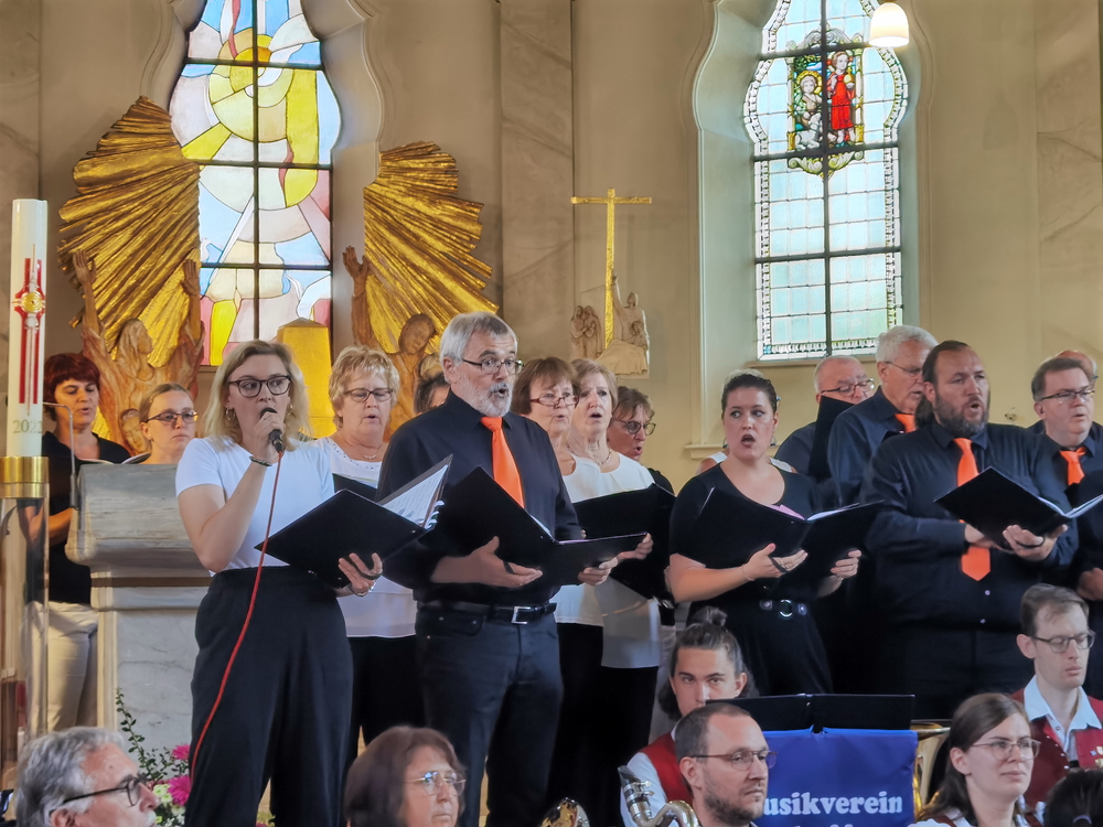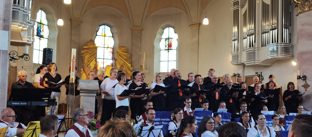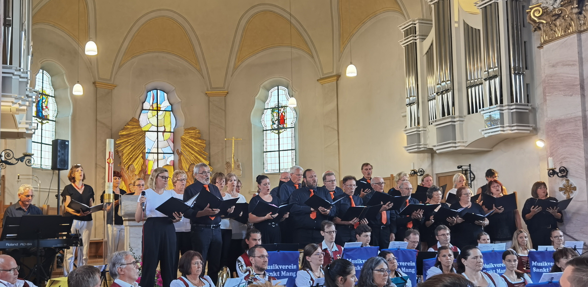 Umso mehr wurden wir am 24. Juli in der Kirche Mariä Himmelfahrt belohnt. Nahezu vollzählig standen Chor und Blasorchester im Chorraum der voll besetzten Kirche und konnten das sehr anspruchsvolle und abwechslungsreiche Programm präsentieren. Nach vielen Wochen und Monaten intensiven Probens - in den Wintermonaten noch über Zoom - konnten wir zeigen, wozu unser Chor zu leisten im Stande ist. Zusammen mit dem Musikverein Sankt Mang und mit Unterstützung durch Hans Augart am Keyboard sangen wir zunächst Teile aus der "Missa festiva" und aus der "Ethno Mass for peace", beide von L. Maierhofer. Während uns diese Lieder aus den Messen schon länger bekannt sind, waren die drei Stücke "Dry your tears, Africa", "Welt in Farbe" und "Sing gently" neu für uns, und es bedurfte schon eine lange Zeit des Probens, bis diese richtig "saßen". Am Ende konnten wir dann mit Fug und Recht behaupten, unsere Sache sehr gut gemacht zu haben. An dieser Stelle geht ein großer Dank an unsere Chorleiterin Eva Brunner, die nicht müde wurde, uns bei den Chorproben die rhythmisch und einsatztechnisch nicht ganz einfachen Stücke so weit "einzutrichtern", bis wir sie fast auswendig singen konnten. Am Ende des Konzerts konnten wir uns über einen lang anhaltenden Applaus sehr freuen, und nach standing ovations waren sogar noch zwei Zugaben notwendig. Vorstandsfrau Cordula bedankte sich im Namen von Chorgemeinschaft und Musikverein sehr herzlich bei den sehr zahlreichen Besucherinnen und Besuchern und überreichte den beiden Dirigentinnen und den Solisten/-innen von Chor (Silke, Nicole, Leo) und Blaskapelle ein Blumengesteck.