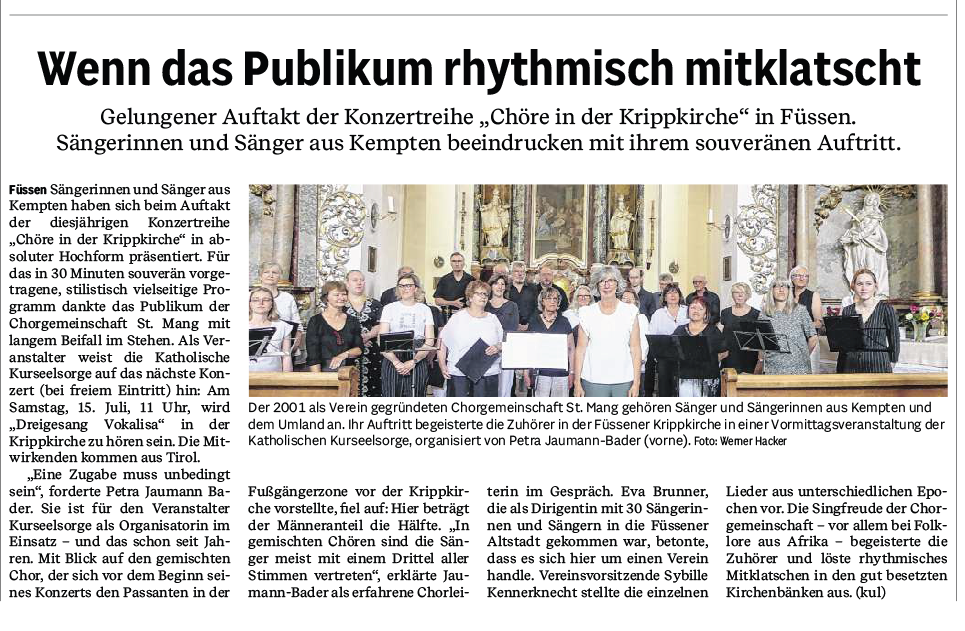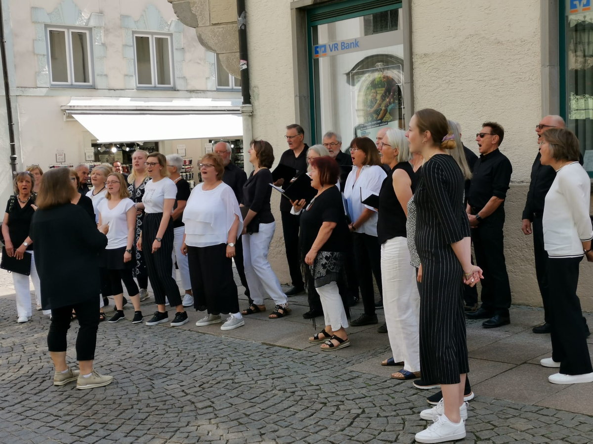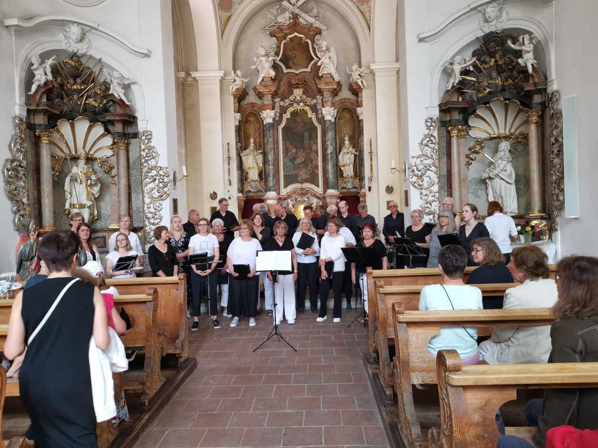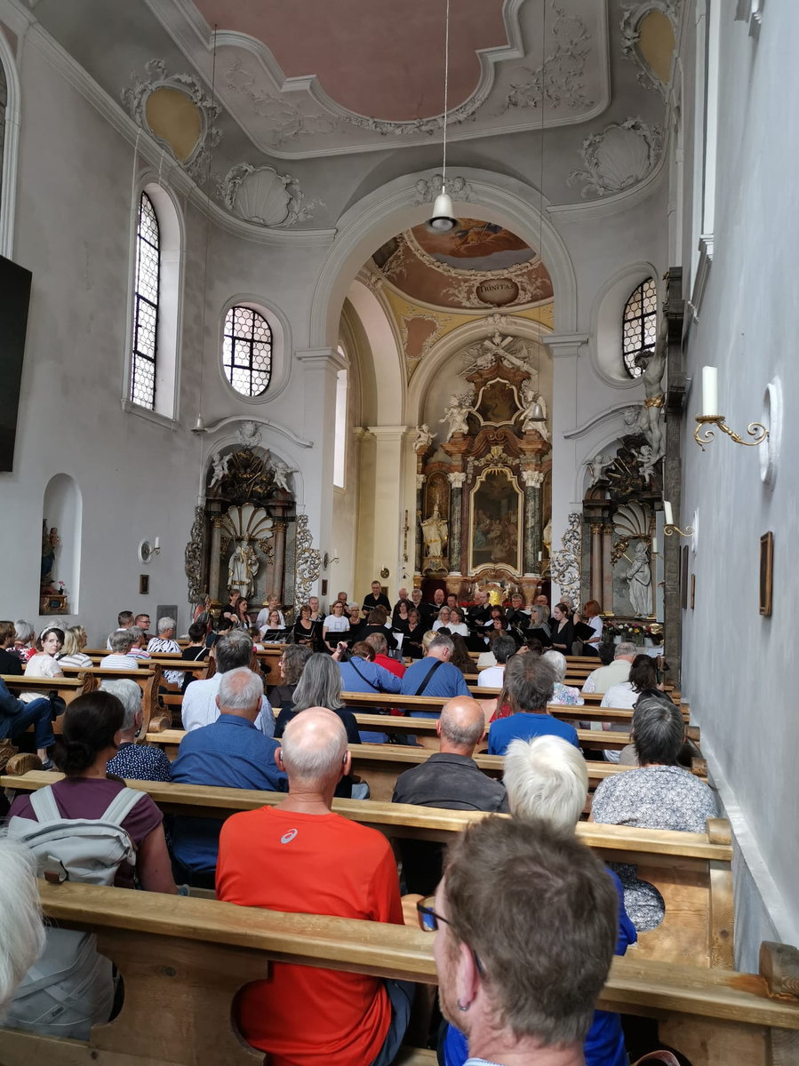 Am 17. Juni klappte endlich, was schon vor drei Jahren geplant war, aber durch Corona immer wieder verschoben werden musste: In der Kripp-Kirche in Füssen gestalteten wir ein Kirchenkonzert in der Hoffnung, dass von den vielen Touristen in der Stadt doch der eine oder die andere zu uns "reinschauen" könnte. Unsere Erwartungen diesbezüglich wurden aber voll übertroffen, denn die Kirche - sie ist nicht besonders groß - war sehr gut gefüllt. Und nicht nur diese Tatsache war sehr positiv, man kann mit Fug und Recht konstatieren, dass uns dieses gut halbstündige Konzert sehr gut gelungen ist, so dass die vielen Zuhörenden spontanen Applaus spendeten und mit standing ovations auch eine Zugabe forderten. Nachdem kurzfristig auch der uns unterstützen sollende Percussionist erkrankte, sangen wir alle Stücke á capella, was wir sonst auch nicht so oft machen. Dabei kam uns die sehr gute Akustik in dieser schönen Kirche zugute, und so war dieser Auftritt insgesamt sehr stimmig. Die Organisatorin dieser Konzertreihe hob am Ende bei ihren Dankesworten ganz besonders hervor, dass wir - in ihrer Wahrnehmung - als Chorgemeinschaft mit einer sehr großen Begeisterung gesungen hätten, die von unserer Chorleiterin Eva auf uns Sängerinnen und Sänger ganz selbstverständlich übergegangen wäre.