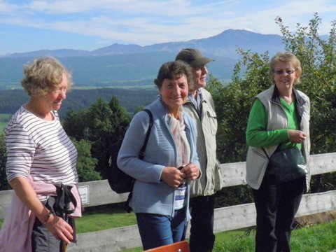 Nach dem Mittagessen entschlossen wir uns kurzfristig, nicht mehr über Gerats an der Nordseite des Sees zurückzulaufen, sondern das Gasthaus „Alpenblick“ hoch über dem See anzusteuern. Die Fußgänger schafften in einer guten halben Stunde den Aufstieg und alle wurden von einem tollen Ausblick belohnt. Die anschließende Kuchen- und Kaffee-Pause war im warmen Sonnenschein der reinste Genuss; und das bei d e r Aussicht.