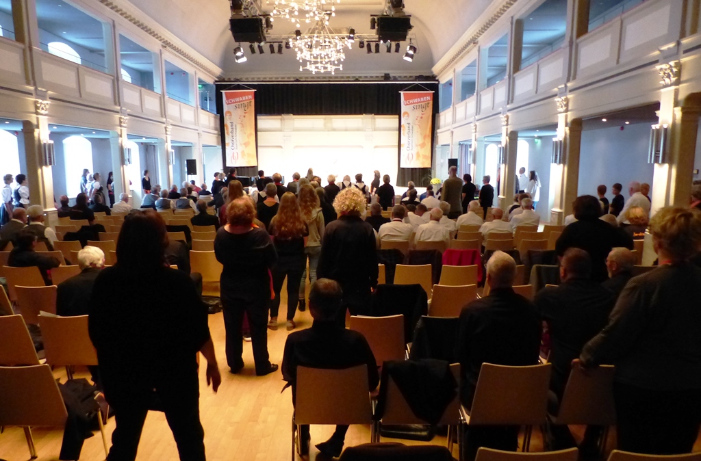 Diese Veranstaltung wurde Monate zuvor als Wertungssingen angekündigt, wurde aber dann mangels Teilnehmer vom CBS als Begegnungssingen umgetitelt. Sechs Chöre waren dazu eingeladen (hatten sich wirklich nicht mehr gemeldet?); neben der Chorgemeinschaft waren dies der Sängerbund Kempten, die Chorgemeinschaft Altusried, der Hard-Chor aus Memmingen, der Chor96 aus Ottobeuren und der Männerchor Wildpoldsried. Jeder dieser Chöre konnte drei Lieder zum Besten geben, wovon eines von dem Allgäuer Komponisten Wolfram Buchenberg sein sollte. Vor dem eigentlichen Konzert war noch eine knappe Stunde Chor-Workshop mit dem bekannten Chorleiter Gary Graden angeboten, bei welchem wir wegen recht viel Einsing-Übungen aber letztlich wenig zum Singen kamen. Schade.