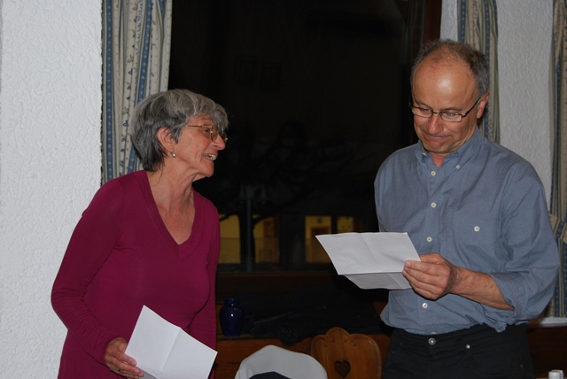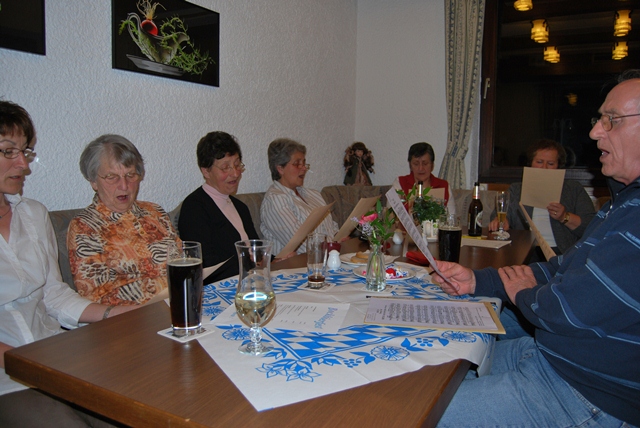 Bei der Chorgemeinschaft haben ein Bruder Barnabas oder eine Mutter Bavaria keine Tradition, aber immer wieder ringt sich der eine oder andere durch, etwas Gereimtes oder einen Sketch zum Besten zu geben. Diesmal spielten Traudl und Dolf eine Szene aus dem Alltag eines Ehepaars, bei welcher sich aus einer einfachen Frage seitens des Ehemannes eine mittlere Ehekrise anzubahnen schien, die aber dann letzten Endes doch noch abgewendet werden konnte. Eine weitere "Einlage" war die Kürung des Weinetiketts für unseren Chorwein. Dolf ließ alle anwesenden Sängerinnen und Sänger zwei Vorschläge dafür abgeben, und eine unabhängige Jury (Rudi Eckart, Petra Berg, Erich Beier) sollte aus den Vorschlägen den besten heraussuchen; dem Gewinner winkte eine Flasche "Kallstädter Saumagen". Gewinner wurde Leo mit seinen beiden Vorschlägen "Vino CamboMagno" und "Sankt Manger Chorstimme"; er wird sich den guten Tropfen gerne schmecken lassen.