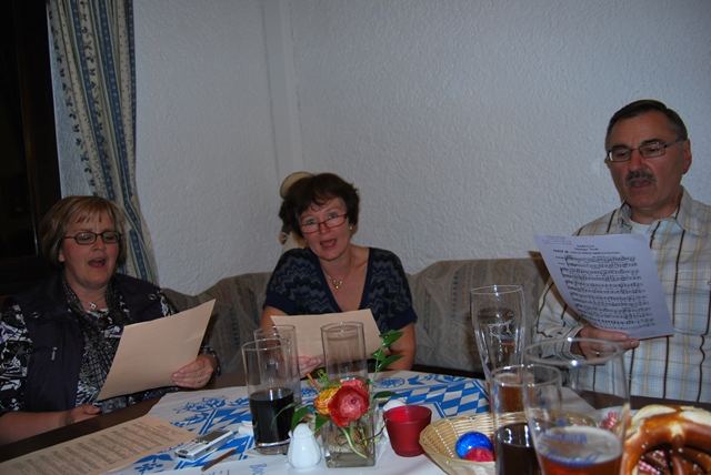 Nachdem Vorsitzender Dolf alle Anwesenden begrüßt und den Abend somit offiziell eröffnet hatte, entwickelte sich rasch eine angeregte Unterhaltung, und alle ließen sich den süffigen Cambonator zusammen mit den herrlichen Brezen und den bunten Eiern schmecken. Je nach individuellem Geschmack ließ man sich dazu auch Deftiges von der Speisekarte kommen, ob es nun Spare Ribs, Wurstsalat oder ein Saurer Romadur waren. Dergestalt gestärkt ging es natürlich auch ans Singen, und so wurde Peters Notenkoffer wieder mal zu einer wichtigen Fundgrube, aus welcher alte und neue "Gassenhauer" herausgekramt wurden. Dabei ist es immer wieder erstaunlich, wie "flüssig" so manches schon lange nicht mehr gesungene Lied dann doch läuft, wenn man vorher genug "Flüssiges" zu sich genommen hat.