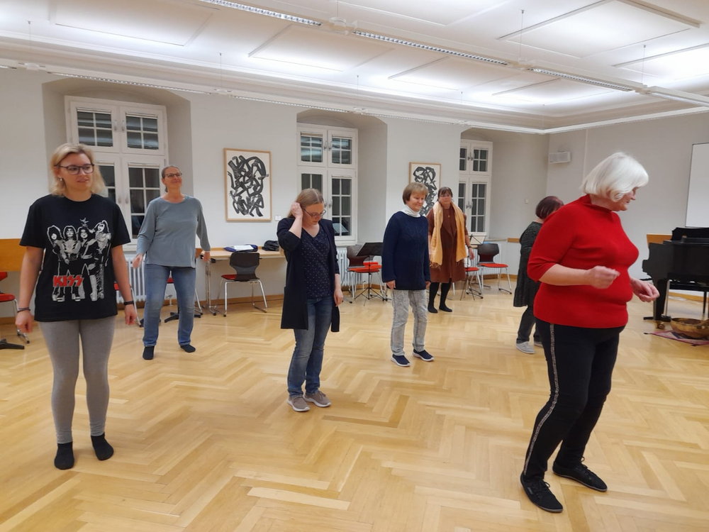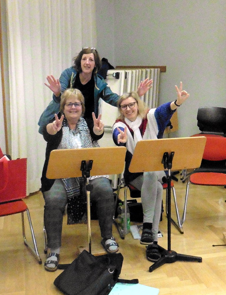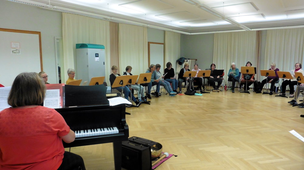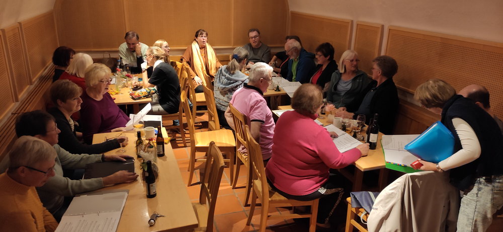 Chorleiterin Eva hatte eine große Fülle an Notenmaterial im Gepäck, als wir am Freitag um 19 Uhr den ersten Probendurchgang hatten. Beim Einsingen hatte es uns vor allem das "Singen im Wald" angetan, und so lief diese erste Probe sehr heiter und produktiv. Am Abend hatten wir das Bierstüble ganz allein, weil wir überraschenderweise auch die einzige Gruppe zu der Zeit im Haus waren. Am Samstag standen drei Probendurchgänge auf dem Programm. Durch die immer wieder neuen (teilweise auch alten) Stücke wurde es uns aber nie langweilig, und das doch sehr nasskalte Wetter draußen war gerade recht zum Arbeiten im Probenraum. In der Mittagspause konnte, wer wollte, auch bei einer Entspannungsübung mitmachen, durch die uns Claudia sehr einfühlsam führte. Am Abend konnten sich dann die Tanzfreudigen unter uns mit Martina im Line Dance üben, ehe dann wieder das Bierstüble lockte. Dort ging es dann mit Ratschen und Singen hoch her, und die Letzten suchten erst nach Mitternacht ihre Zimmer auf.
