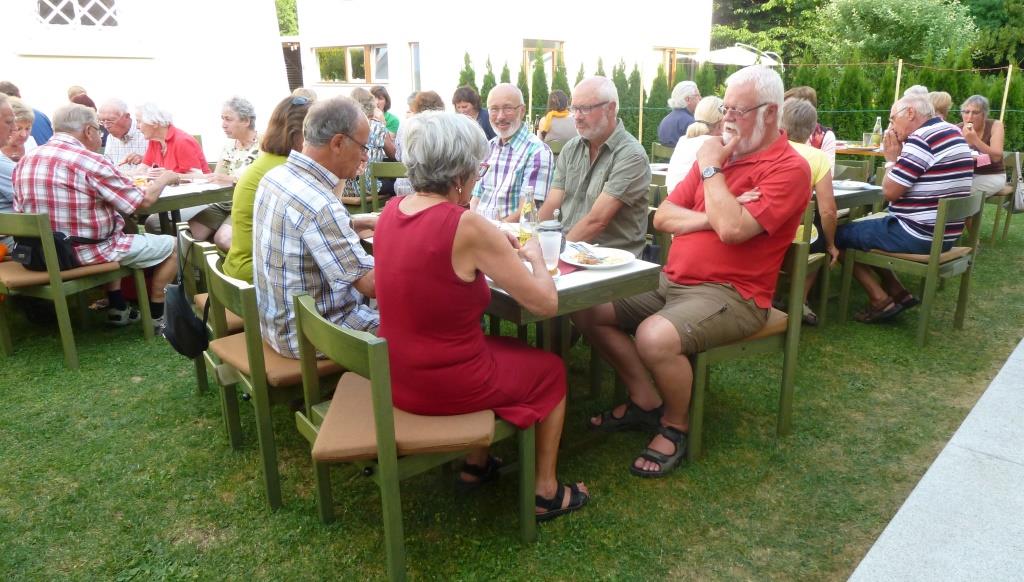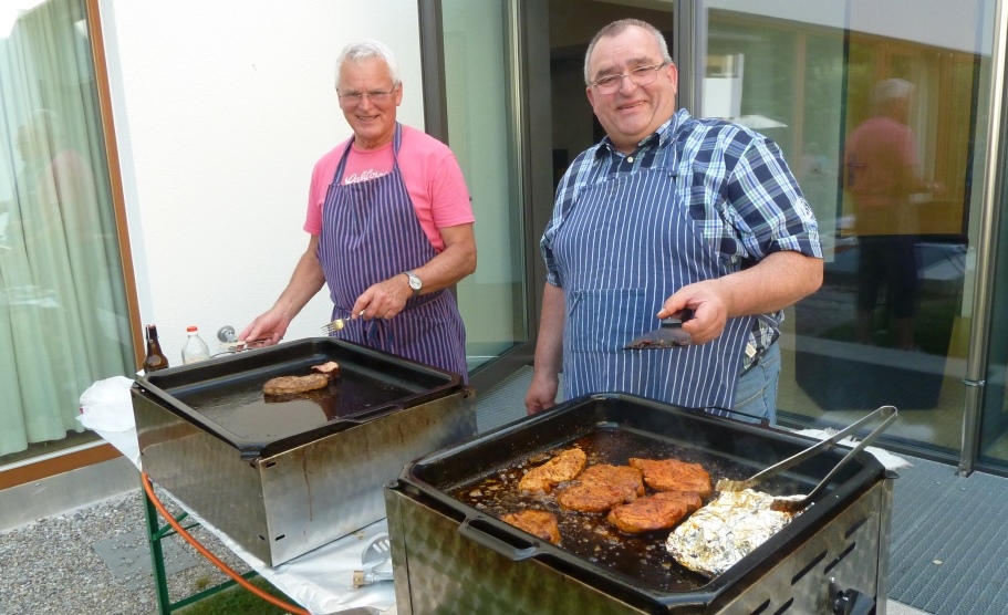 Der Platz für das Buffet mit den mitgebrachten Salaten und Nachspeisen reichte kaum aus, so eifrig waren die Chorleute mit dem Vorbereiten der verschiedensten Köstlichkeiten. Armin und Peter Berg waren die Grillmeister, die mit viel Übersicht und Gefühl jedem sein Steak brutzelten. Auch waren einige passive Chormitglieder unter uns und zeigten damit ihre ungebrochene Verbundenheit mit der Chorgemeinschaft. Nachdem sich jeder körperlich gestärkt hatte, ging es natürlich auch ans Singen, und so wurden einige Chor-Schlager zum Besten gegeben, manche aus der Liedermappe, aber einige gingen auch auswendig, wie z. B. zum Erstaunen aller der erst jüngst einstudierte "Drunken sailor".