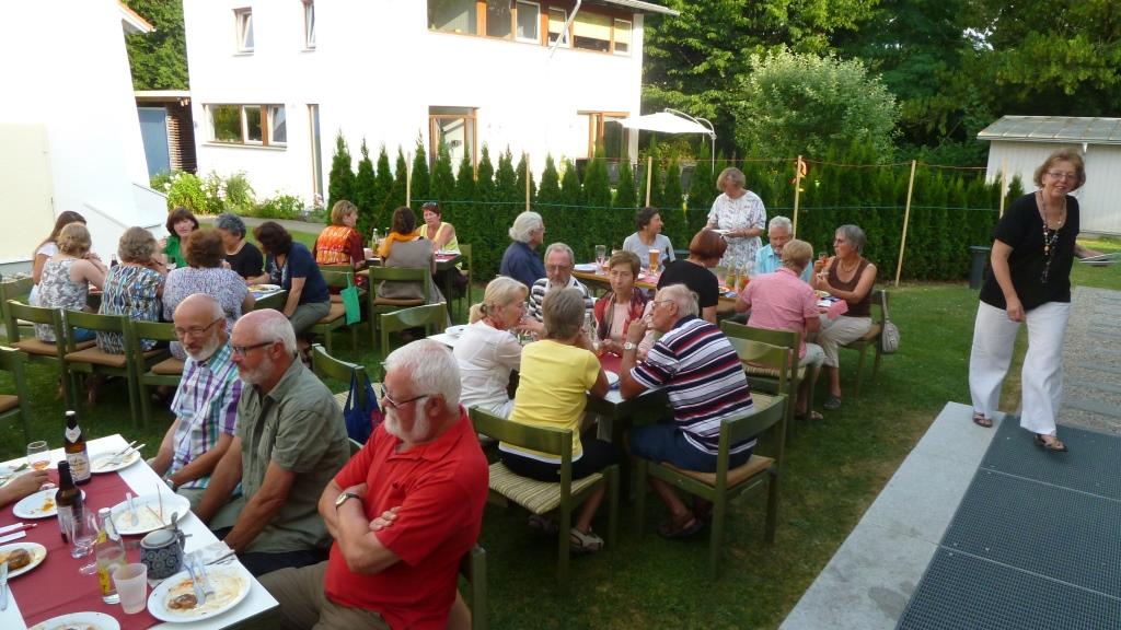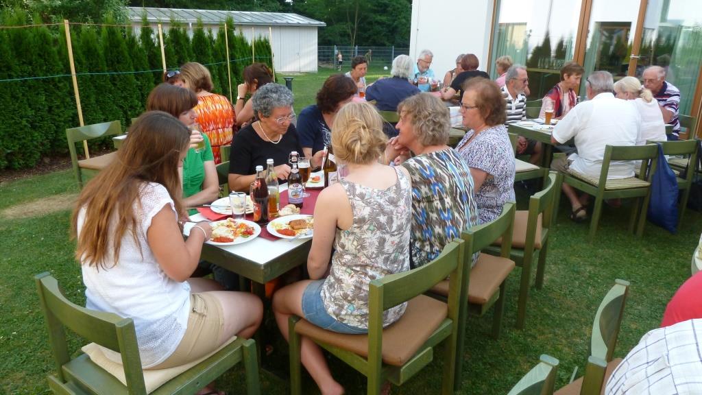 Auch dieses Jahr meinte es der Wettergott gut mit uns beim Termin für das Grillfest. Eine für das Allgäu schon unglaublich lange Schönwetterperiode hielt auch noch am späten Nachmittag bzw. Abend des 23. Juli, und so trafen sich kurz nach vier Uhr etliche Helfer, um Tische, Stühle, Geschirr und Grill auf dem Platz zwischen dem Saal und der Christuskirche herzurichten. Um 18:00 Uhr waren die Plätze dann schon fast alle besetzt, als Vorstand Dolf den "Startschuss" für das Chor-Grillfest 2013 gab.