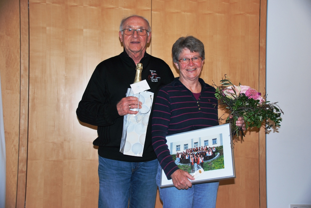 Dann durfte Peter Berg auch eine seltene Ehrung durchführen: Für 50 Jahre Chorgesang konnte er Sopranistin Angela Herb neben der Urkunde auch die Goldene Nadel des Chorverbandes überreichen. Und gleich noch eine Würdigung in der Familie Herb: Für seine langjährige Tätigkeit als nimmermüder Notenwart (29 Jahre) wurde Peter Herb besonders geehrt.