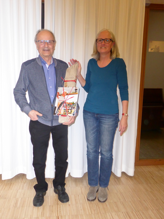 Im Anschluss daran bat Cordula ihren Amtsvorgänger Dolf Balla vorzutreten. Nachdem er durch seine schwere Krankheit lange Zeit außer Gefecht gesetzt war und wir mit ihm bange Monate zu überstehen hatten, besucht Dolf nun seit Jahresbeginn wieder unsere Chorproben. Und so konnte er nun vom ganzen Chor und auch etlichen passiven Mitgliedern gebührend aus seinem Amt als Vorsitzender verabschiedet werden. Es wurden viele seiner "Taten" aufgezählt, und da wurde so manchem bewusst, was es heißt, als Vorsitzende/r einen Chor wie den unseren zu führen. Als Erinnerung an seine "Taten" überreichte Cordula ihrem Vorgänger ein von Leo gestaltetes Fotobuch mit dem beziehungsreichen Titel "Leinen los", in Anspielung auf Dolfs Leidenschaft, das Segeln. Leinen kann man losmachen, um auf Reise zu gehen, aber genauso kann man Leinen loslassen von einem Amt, das man einmal bekleidet hat. Wir wünschen unserem Dolf eine weiterhin gute Genesung und noch viel Freude beim Singen im Tenor.