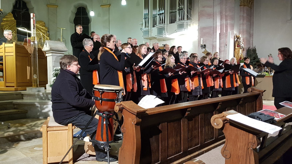 Den zweiten Teil des Konzerts prägte die Chorgemeinschaft mit schmissigen irischen Weihnachtsliedern, die fast schon zum Tanzen anregten: "Glorious Kingdom", "Sheperds Run" und dem "Lord of the dance". Bei diesen Liedern wurden wir auch von Thomas Schiller mit seiner Percussion toll unterstützt. Man spürte, dass die Sängerinnen und Sänger diese flotten Lieder sehr gerne sangen, und es sprang entsprechend der Funke über. Das abschließende "Celtic Advent Carol" setzte mit seiner schön fließenden Melodie, dazu noch mit zwei Tonartwechseln, einen sehr stimmungsvollen Schlusspunkt hinter diesen Teil.