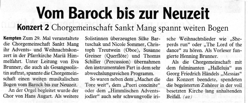 Chorleiterin Eva studierte mit uns für diesen Auftritt Lieder aus dem Barock, der Romantik und natürlich aus der Neuzeit ein. Wir begannen mit dem schon mehrmals aufgeführten "Machet die Tore weit" an, an der Orgel begleitet von Hans Augart, der wie immer eine sehr wichtige Stütze war. Es folgten das "Redemptor nobis natus est" (Soli: Silke und Nicole) und das "Pueri concinite", bei dem Eva selbst das Solo übernahm und Leo den Chor leiten durfte. Nach einer Lesung, die dankenswerterweise Henning Brunner übernahm und einem weiteren Solo von Eva sangen wir drei Lieder von Lorenz Maierhofer: "Wieder naht der heil'ge Stern", "Am Weihnachtstag, Curoo" und den "Himmlischen Adventsjodler". Ein besonderes Highlight waren die Instrumentalstücke, bei denen Christoph Treutwein an der Oboe und Susanne Greiner mit der Flöte, wieder begleitet von Hans Augart an der Orgel, sehr stimmungsvolle Akzente setzten.