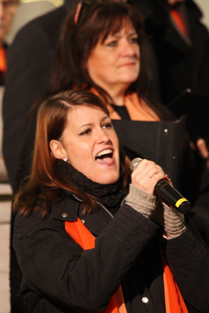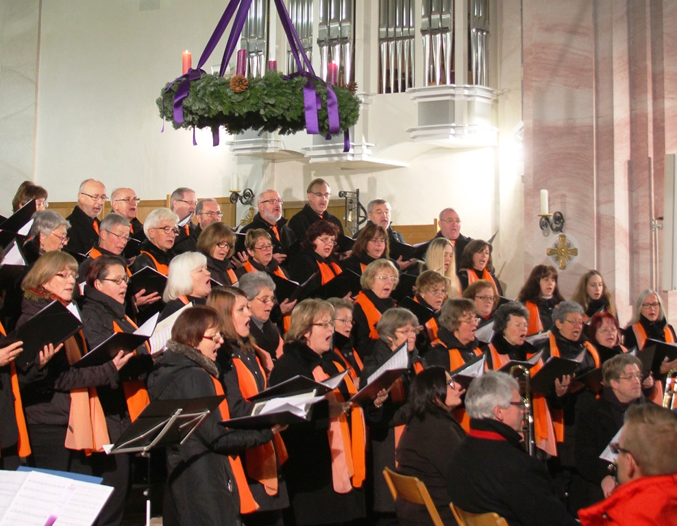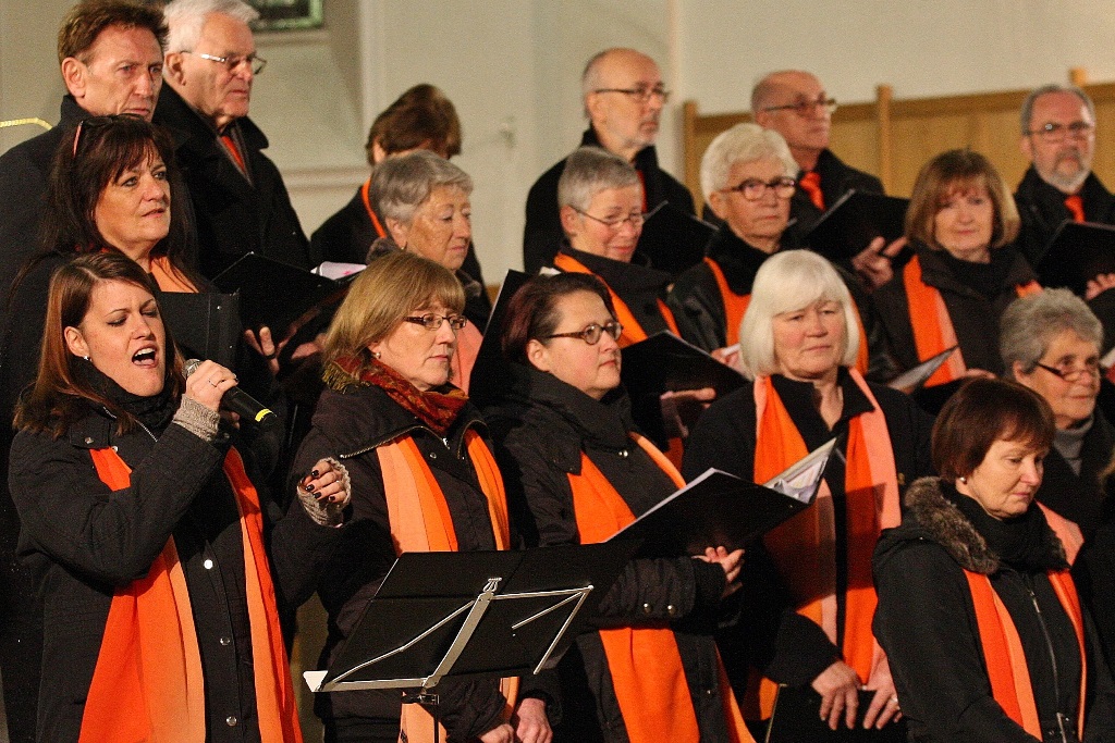 Nach der Eröffnung durch die Bläser sang die Chorgemeinschaft mit großer Begeisterung das herrliche "Jubilate Deo" von Halmos, anschließend konnte Leo das "Pueri concinite" dirigieren, da hier unsere Chorleiterin Eva den Solo-Part übernahm. In Abwechlung mit den Bläsern folgten mehrere bekannte und auch neue Lieder, wie z. B. "Christmas Lullaby" von Figallo und Rutter oder "May God bless you" und "Herrlich ist der Himmel blau", um nur einige zu nennen. Ein Höhepunkt waren zweifellos die beiden Soli "Ave Maria" und "Silent night", die unser "Eigengewächs" Silke Bartuschak mit herrlich einfühlsamer Stimme vortrug. Begleitet wurde sie hier am Keyboard von Hans Augart, der übrigens als Chef des Bläserquartetts und als Organist an diesem Nachmittag alle Hände (und den Mund) voll zu tun hatte, musste er ja zwischen drei Positionen hin und her pendeln. Ihm gilt hier besonderer Dank, meisterte er doch seine Aufgaben wie gewohnt bravourös. Nach dem letzten Lied "Heil'ge Nacht" brandete dann lang anhaltender Beifall auf, den sich alle Mitwirkenden redlich verdient hatten. Die freiwillige Spende am Ende der Veranstaltung erhalten dieses Jahr das Sankt Manger Stadtteilbüro und die Diakonie.