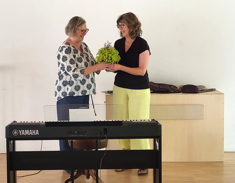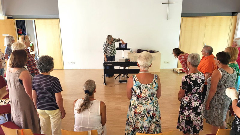 Schon seit längerem war in der Vorstandschaft die Notwendigkeit für eine Stimmbildungsveranstaltung aufgekommen. So klappte es nun am 5. Juli, und wir konnten als Referentin eine absolute Fachfrau, Frau Helen van Almsick, dafür gewinnen. Frau van Almsick ist seit über 30 Jahren auf dem Gebiet Stimmbildung, Supervision, Coaching, Gesangsunterricht und in vielfältigen Workshops in ganz Deutschland unterwegs, arbeitet aber auch seit Jahren an der Musikakademie in Marktoberdorf. Nun konnte sie uns in gut zweieinhalb Stunden sehr Vieles zeigen und Tipps für unsere Probenarbeit geben.